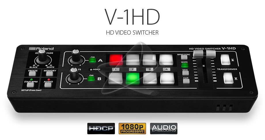 A Roland V-1HD egy 4x HDMI bemenetes Switcher, melymérete és kezelhetősége révén praktikus megoldás a HDvideo műsorkészítés számára. A bemeneteket nem szükséges külön szinkronizálni, így nagyon gyors installáció valósítható meg. A tartozék vezérlő szoftverrel USB port által PC vagyiPad irányítás is könnyedén megoldható. Válassza ki az adott feladat felbontását és máris mixelheti a bemeneti források képét. Beépített hangkeverője 12 csatornás hang kezelésére alkalmas, a HDMI jelek hangját le tudja választani, vagy egyesíteni is tudja ezeket. 4 HDMI bemenet PC-ről is vezérelhető +12 csatornás digitális hangkeverő kézi T-BAR Program kimenet és Multi-viewer / Preview kimenet Picture-In-Picture különleges video effektek.