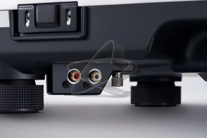 A lejátszókar alatt aranyozott csatlakozókat találunk, amelyek többféle kábel csatlakoztaását teszik lehetővé.